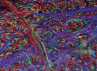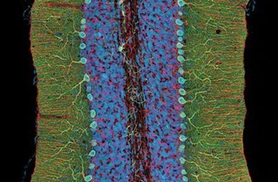用暗視場顯微鏡觀察的復雜的大腦 復雜的大腦:美國加利福尼亞大學圣迭戈分校的托馬斯•迪林克(Thomas Deerinck)利用雙光子顯微技術(2-photon microscopy),拍攝到了一塊僅有400μm厚的小鼠小腦組織樣本的精細顯微結構(見上圖),其中綠色的是浦肯野神經細胞(Purkinje neuron),紅色的是神經膠質細胞(glial cell),藍色的則是神經核。