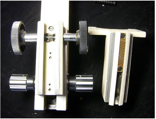 本來這種顯微鏡齒輪會剛好卡住,不過有時候轉到較高或較低的時候,會鬆卡,這時候如果硬轉,右邊那個齒板的齒就會被齒輪磨平。較后的結果就是粗調節(jié)輪會鬆,載物臺就會掉下來,這種情況只有換齒板才能解決。