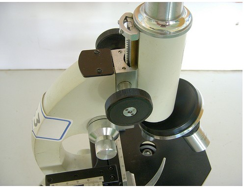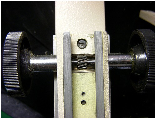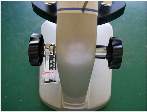 粗調節(jié)輪是怎麼「粗」調的呢?無論是顯微鏡調鏡筒還是載物臺的高度,原理都一樣,都是利用齒輪。在圖中,把鏡筒升高之后,后面就可以看到一齒一齒的東西,有時候顯微鏡會發(fā)生粗調節(jié)輪調到正確高度,卻又慢慢滑下來,原因就發(fā)生在那一齒齒的上面。
