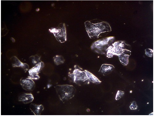 我們常用的的顯微鏡是屬于亮視野顯微鏡,背景是亮的。而這圖的背景是暗的,所以稱為暗視野。暗視野顯微鏡的特點是可以分辨極微小顆粒的存在或運動(解像力約是0.004um),一般的顯微鏡較大解像力約(0.2um),這樣的差別來自入射光線的特性。