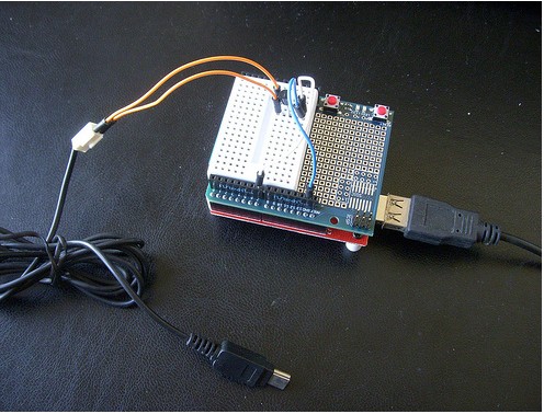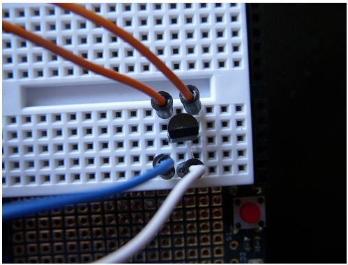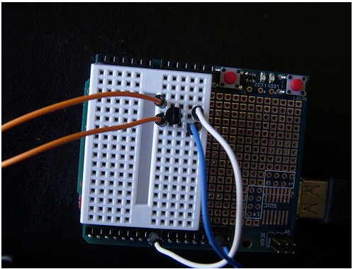 USB快門線的兩條橘線連接到電晶體的B和E,白線是從arduino的digit pin7接過來的,藍(lán)線是接到arduino的Gnd
