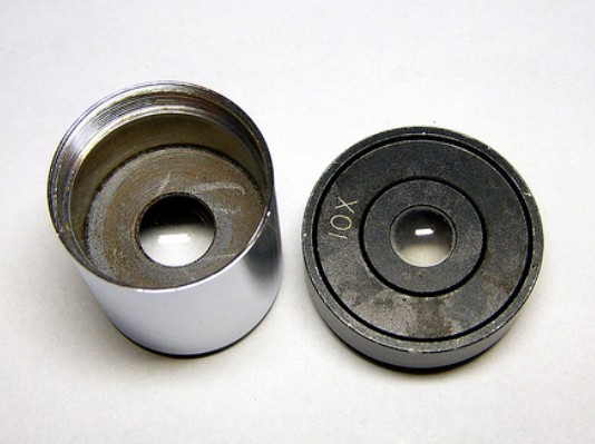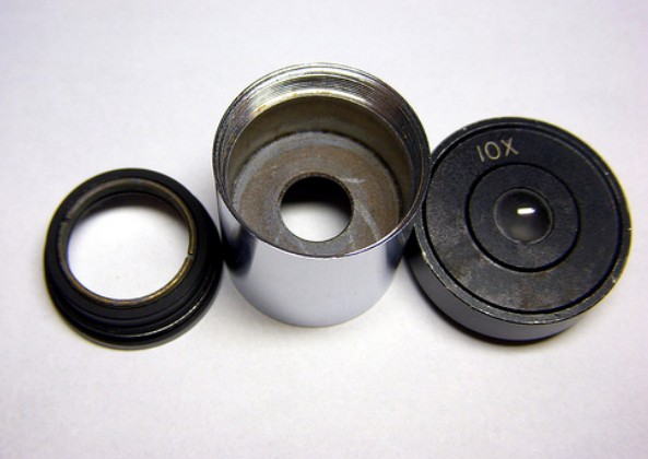 10X的物鏡稍微複雜一點。順帶一提,顯微鏡10X物鏡拆到較后,得到的中間那玩意超棒!可以當作高倍的放大鏡來用。只用這個東西,我甚至可以直接靠在吊竹草的葉背,看見氣孔的分佈,或是靠在蕨葉背,看見孢子囊的環紋。