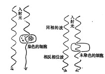 光的相位發(fā)生變化,通過細(xì)胞厚而致密的部位(如核)時光速變慢,與通過鄰近薄的部位